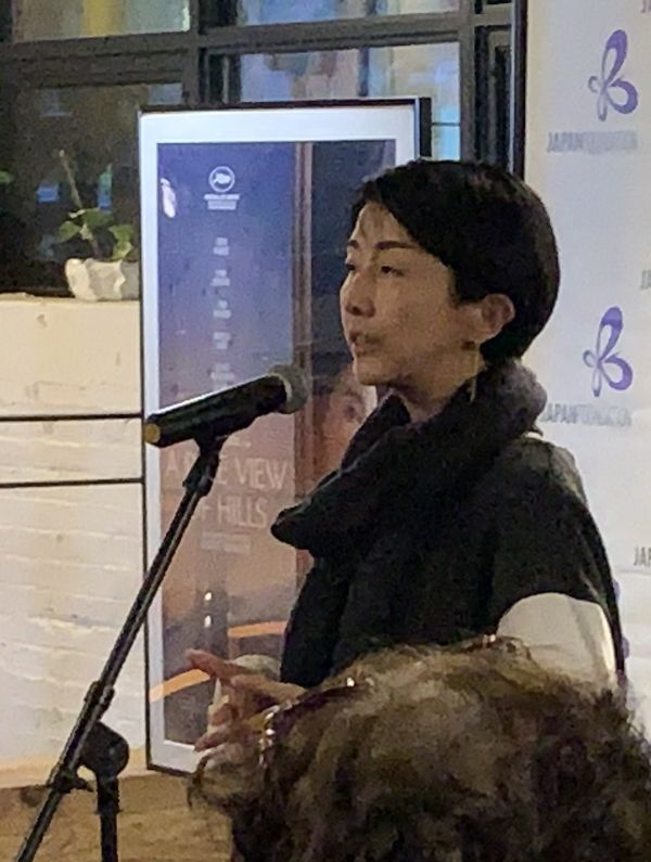 「わずかな見せかけ」の斎藤英理監督。主演の芥川龍之介役を演じた俳優の黒住尚生さんも会場でスピーチを行った。